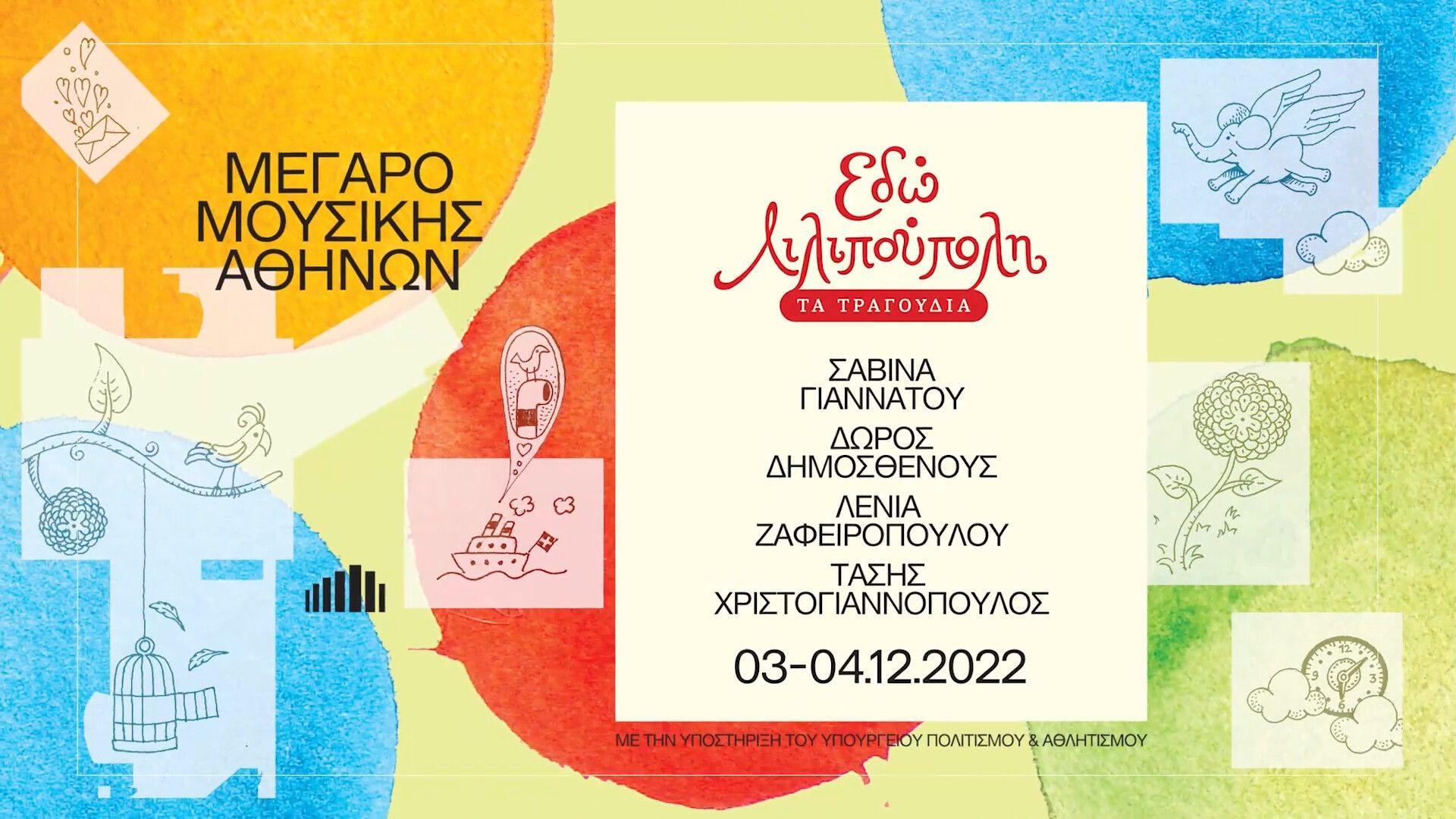 «Εδώ Λιλιπούπολη» – Τα τραγούδια : Η θρυλική ραδιοφωνική σειρά που συνδέθηκε με την εποχή του Μάνου Χατζιδάκι στο Τρίτο Πρόγραμμα της ΕΡΤ (1976-1980) και μεγάλωσε ως σήμερα γενιές και γενιές, ξαναζωντανεύει στο Μέγαρο Μουσικής Αθηνών και μας παρασύρει στον κόσμο των αγαπημένων τραγουδιών, σε μουσική Νίκου Κυπουργού, Δημήτρη Μαραγκόπουλου, Λένας Πλάτωνος, Νίκου Χριστοδούλου και στίχους της Μαριανίνας Κριεζή.