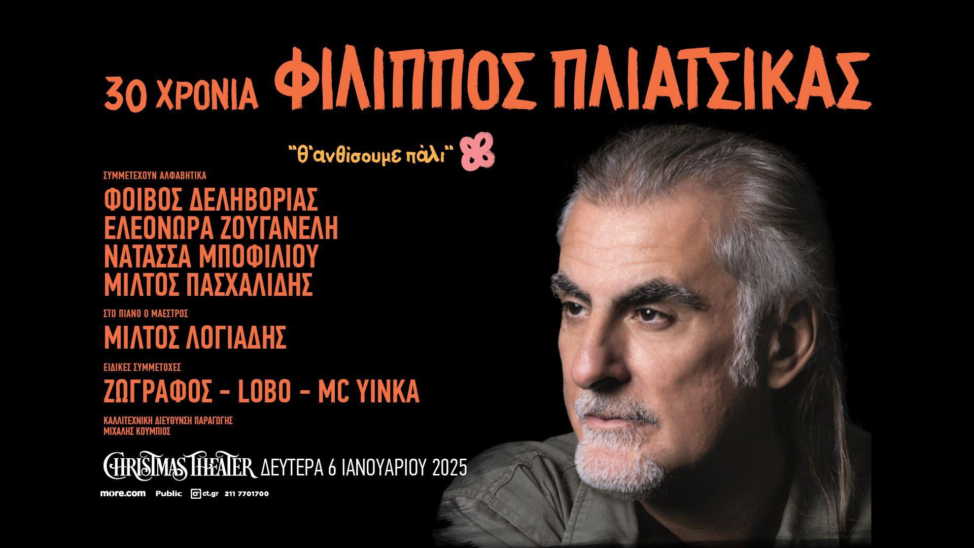Με αφορμή την κυκλοφορία του άλμπουμ «Θ ’ανθίσουμε πάλι», ο Φίλιππος Πλιάτσικας έρχεται στο Christmas Theater για ένα ταξίδι – αναδρομή σε τραγούδια τριών δεκαετιών, μαζί με φωτεινούς συνοδοιπόρους που συνδέθηκαν μαζί του δισκογραφικά και όχι μόνο.