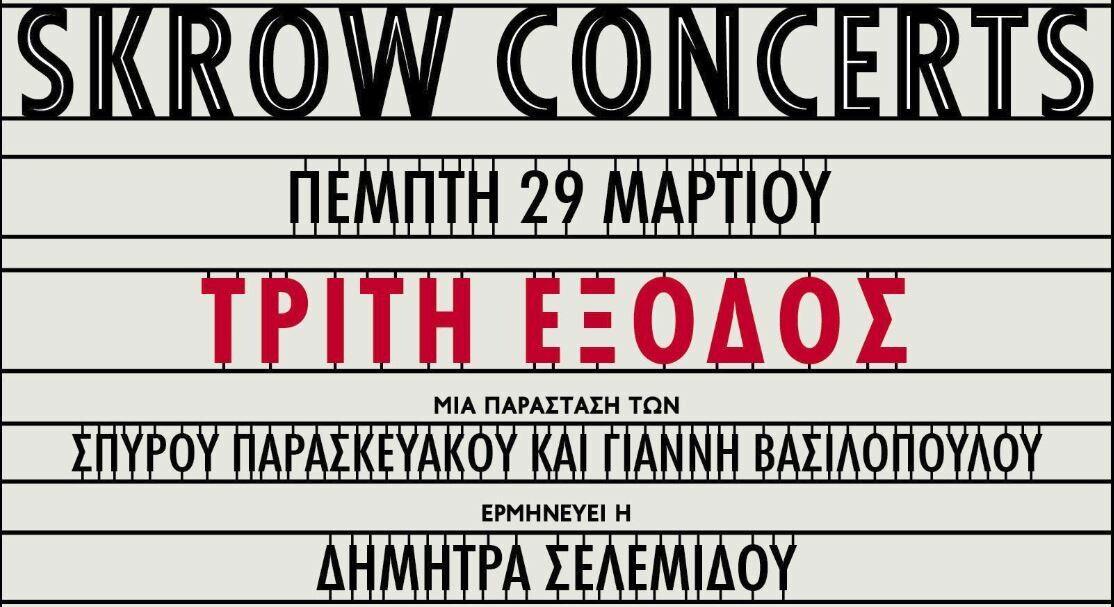 Έχοντας ως κεντρικό άξονα την πρώτη τους δισκογραφική συνάντηση με τίτλο «Τρίτη έξοδος» και στο πλαίσιο των καθιερωμένων πια Concerts του SkrowTheater, ο συνθέτης Σπύρος Παρασκευάκος, ο στιχουργός Γιάννης Βασιλόπουλος και η ερμηνεύτρια Δήμητρα Σελεμίδου, παιδιά της 4ης Ακρόασης της Μικρής Άρκτου, υποδέχονται την άνοιξη στις 29 Μαρτίου με μια ανανεωμένη μουσικοθεατρική πρόταση.