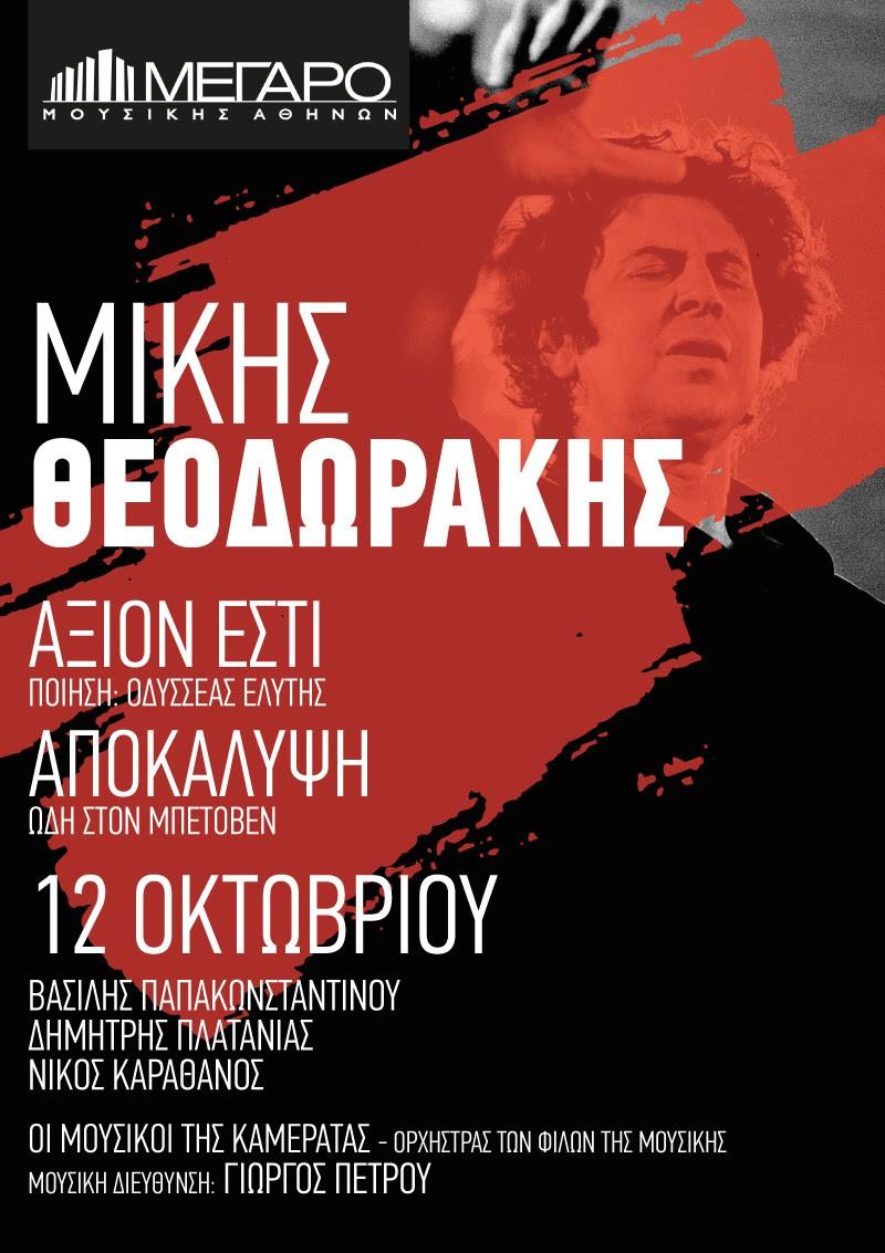 Τέσσερις αναγνωρισμένοι έλληνες καλλιτέχνες με διεθνή πορεία, ο ηθοποιός Νίκος Καραθάνος, ο τραγουδιστής Βασίλης Παπακωνσταντίνου, ο βαρύτονος Δημήτρης Πλατανιάς και ο μαέστρος Γιώργος Πέτρου δημιούργησαν μια κορυφαία dream team που θα αναμετρηθεί, την Παρασκευή 12 Οκτωβρίου (8:30 μ.μ.) στην Αίθουσα Χρήστος Λαμπράκης, με ένα από τα έργα-ορόσημα της μεταπολεμικής μας ιστορίας, «Το Άξιον εστί» (1964) του Μίκη Θεοδωράκη σε ποίηση Οδυσσέα Ελύτη. Σε αυτή την συναυλία που αποτελεί το μουσικό γεγονός του φετινού φθινοπώρου, συμμετέχουν ακόμη οι πολυβραβευμένοι Μουσικοί της Καμεράτας – Ορχήστρας των Φίλων της Μουσικής και η καταξιωμένη Χορωδία των Μουσικών Συνόλων του Δήμου Αθηναίων υπό τον Σταύρο Μπερή.