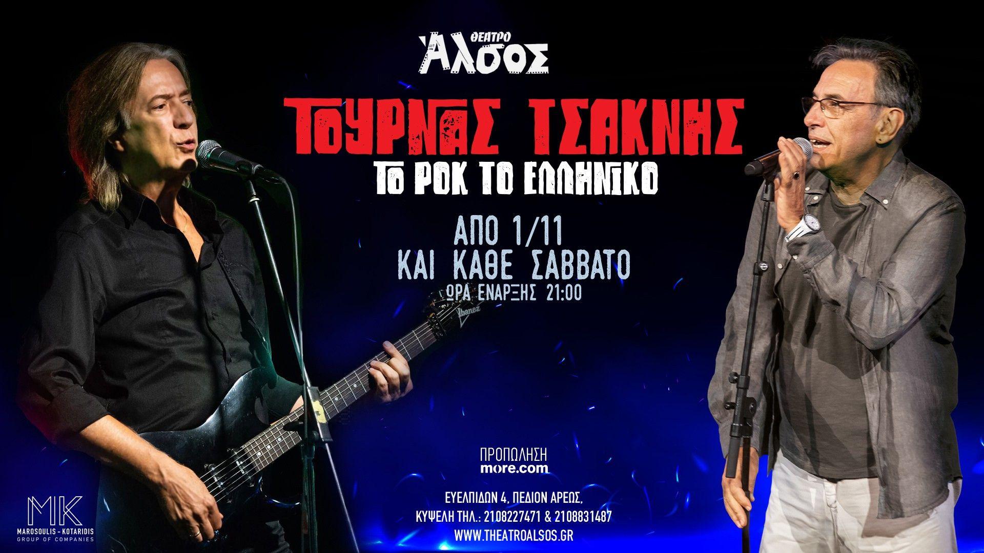 Από το Σάββατο 1η Νοεμβρίου, και κάθε Σάββατο, στις 21:00 το Θέατρο Άλσος υποδέχεται τον Κώστα Τουρνά και τον Διονύση Τσακνή σε μια μοναδική μουσική συνάντηση με τίτλο «Το Ροκ το Ελληνικό».