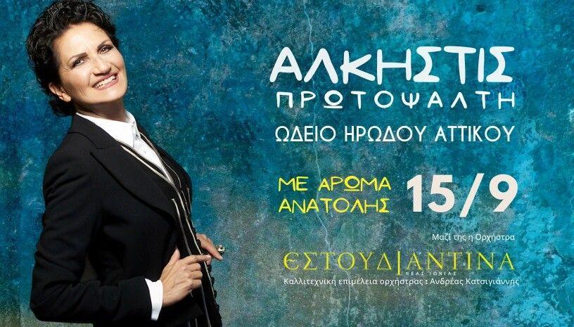 Η Άλκηστις Πρωτοψάλτη, η τόσο ξεχωριστή ερμηνεύτρια που πάντα μας εκπλήσσει με τις μουσικές της προτάσεις, μετά τις sold-out εμφανίσεις της και τις διθυραμβικές κριτικές τον Μάρτιο στο Μέγαρο Μουσικής Αθηνών -που διακόπηκαν λόγω κορονοϊού- συναντά και πάλι τον εξαίρετο συνθέτη Ανδρέα Κατσιγιάννη και την Ορχήστρα Εστουδιαντίνα Nέας Ιωνίας, φέρνοντας και στο Ωδείο Ηρώδου του Αττικού μελωδίες με έντονο άρωμα Ανατολής, τραγούδια από τη μουσική της διαδρομή που ταιριάζουν απόλυτα με τους υπέροχους ήχους της παράδοσης αλλά και της Μεσογείου!